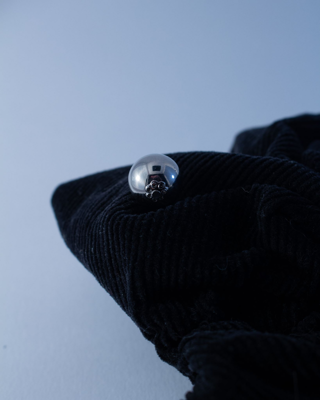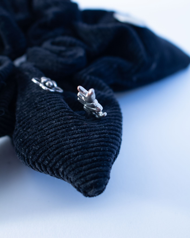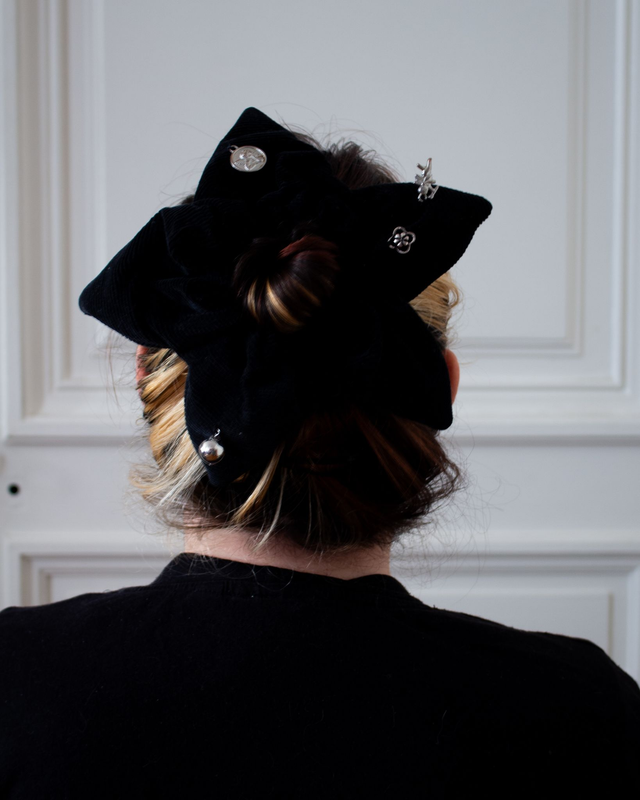 Un scrunchy noir en forme d’étoile, en velours côtelé, avec de petits pendentifs argentés cousus dessus. Parfait pour compléter un look sombre et élégant.