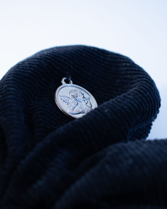 Un scrunchy noir en forme de fleur, en velours côtelé, avec de petits pendentifs argentés cousus dessus. Un accessoire simple pour ajouter une touche originale à vos cheveux.